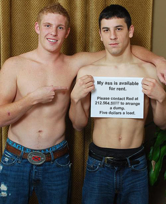Two days after Red popped my ass cherry and made me pose for this photo, my life as I knew it was over. The next day he posted this image, and 48 hours later I was face down on a bed in a motel on Route 8. It was 2:00 and I had already taken twelve loads of cum. As I looked around, I saw eight guys waiting to take a ride, five of them were teammates of mine. They were stroking their cocks watching me get ass fucked. With one photo I had gone from alpha male jock to cheap cum whore.