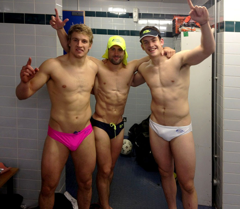 That look on his face is because their cum is dripping into the back of his speedo and he knows it will be visible to all his friends when they leave the locker room.