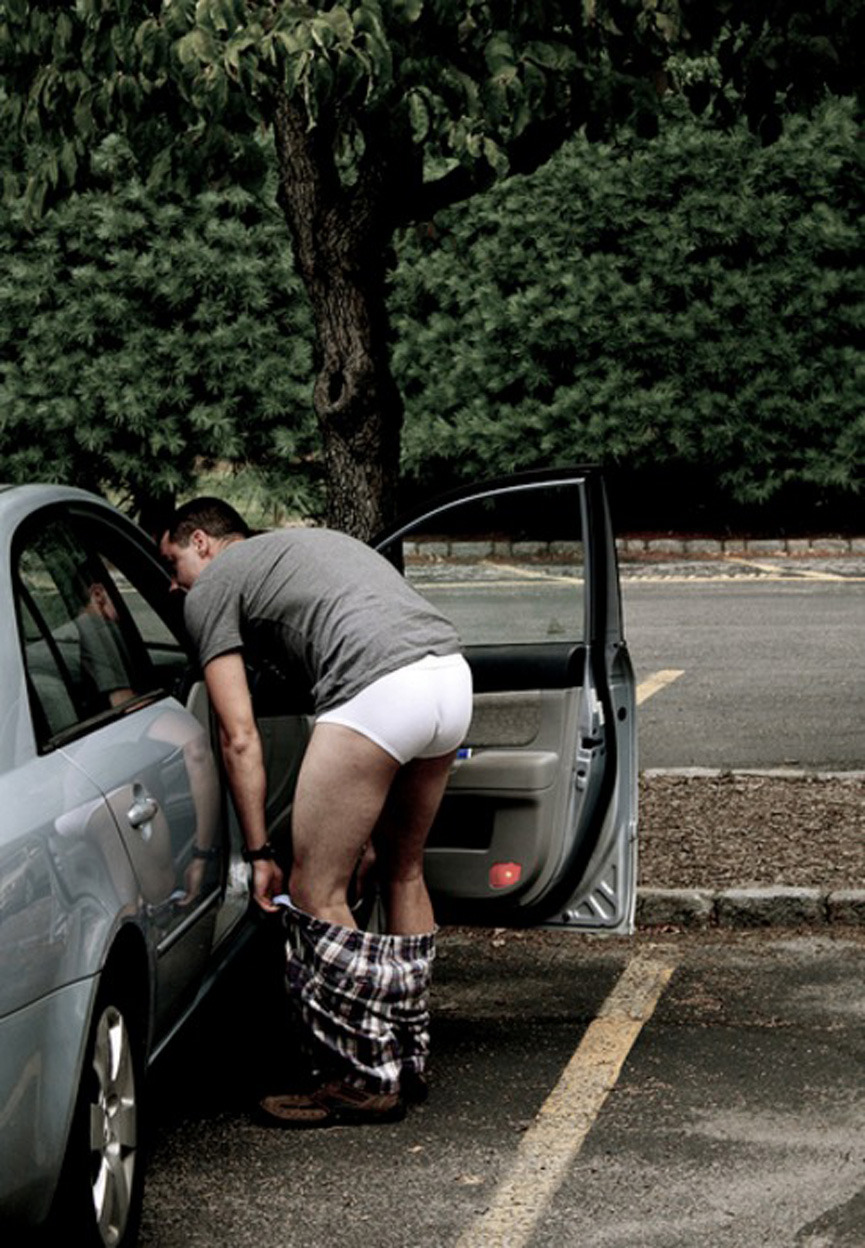 Pete always made sure to park at the far end of the rest stop, with his passenger door facing the parked semi’s. He would then slowly change into shorts, making sure to bend over with his tightey whitey clad ass on full display.