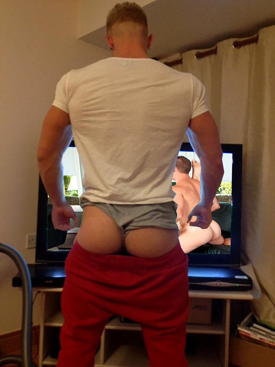 He re-starts the video from the beginning and starts jerking his rigid boner, while noticing the empty feeling in his ass.