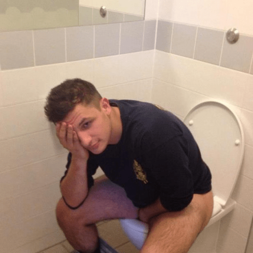 Hungover and shitting out loads of his frat bros cum. Not sure how many loads, but enough that a full night’s sleep with a butt plug was not enough time for his body to absorb all the jizz dumped in his ass yesterday.