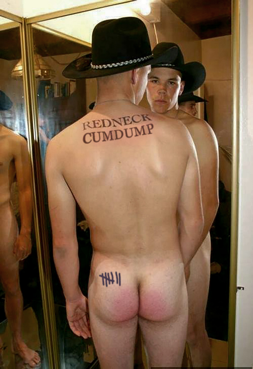 John quickly learned his place and could be found most nights, bent over in a animal pen taking cock. On his first month anniversary, the guys got him drunk again, gave him a black cowboy hat, locked his cock up in a chastity cage, ran a train on his ass, and got him a nifty new tattoo.