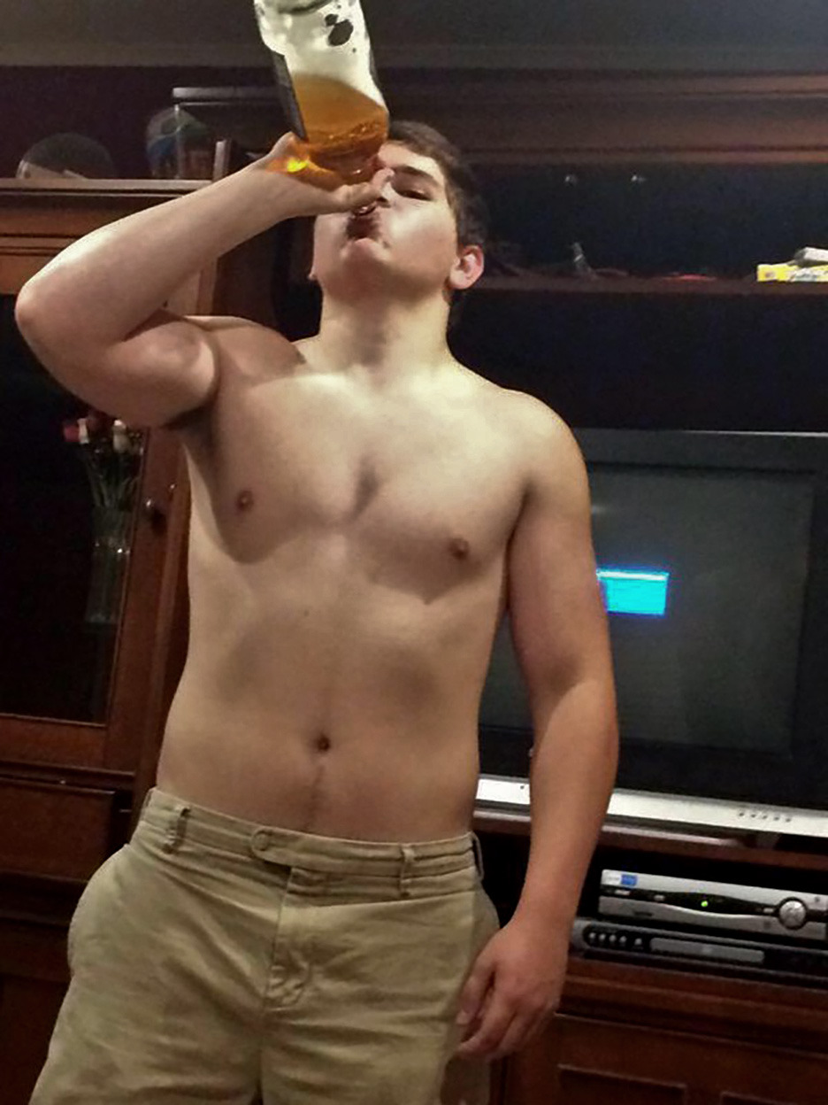 Fuck, look at him go. That is one thirsty pledge. He’s chugging the full forty ounces of warm, recycled beer. I would have never believed it if I did not see it with my own two eyes. He must really like the taste of Alpha piss.