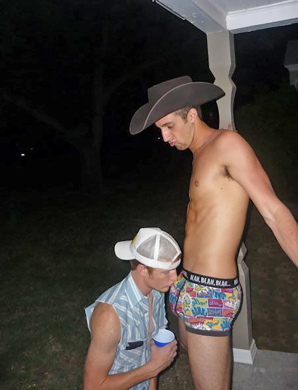 Drunk buddies on the back porch, about to take their “friendship” to a new level. It starts with a dare and a quick kiss of Brian’s junk thru the fabric of his underwear. After the kiss, Pete stays on his knees in front of his buddy, watching the front of his underwear tent out as Brian’s cock gets fully erect. Before the night is over Pete will swallow several loads of his friends redneck sperm. From this point forward whenever Brian gets horny he will call on his “friend” to provide him with a quick bro-job.