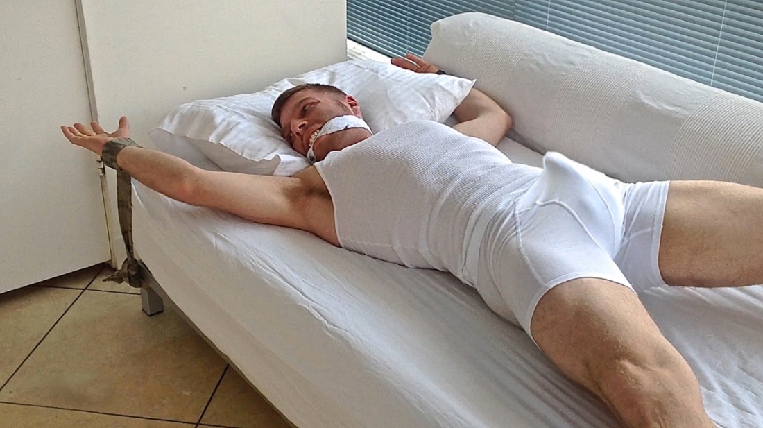 He was struggling and fighting against the restraints. As I described what we were planning to do to him his eyes got wide and he shook his head side to side. He obviously did not like the idea of being raped by me and my friends. He still thought of himself as a straight man. He could not imagine our cocks penetrating his virgin holes, using him as a fuck toy. His mind was fighting it, but the boner in his boxer briefs was giving away the fact that his body wanted to be used. We had seen him checking us out in the gym, and had pegged him as a faggot. He was so far in the closet that he did not even realize himself that he was hungry for dick. We decided, that for his own good, we would help him out.