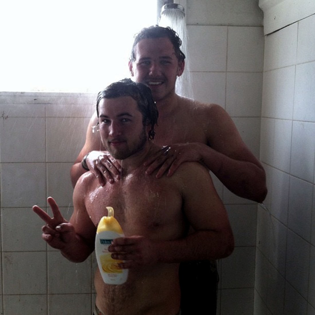 with a man pressed tightly behind him. The jocks singlet obscenely tented and a