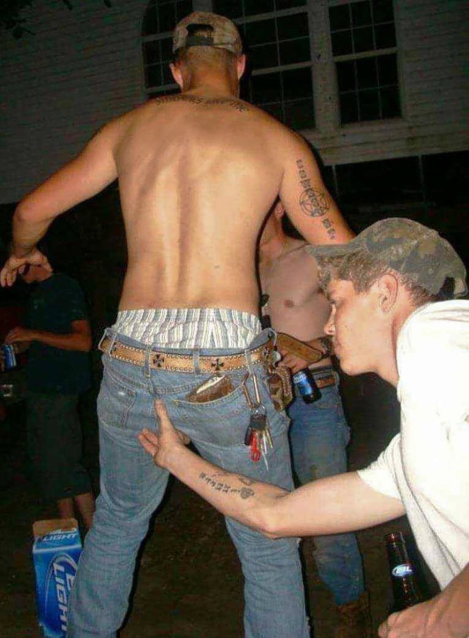 Dude, your butt plug is showing. You need to clench those cheeks a little tighter. Wouldn’t want to have it slip out, here in the middle of the kegger. I doubt you want your redneck buddies to know you have a cum filled cunt, do you?